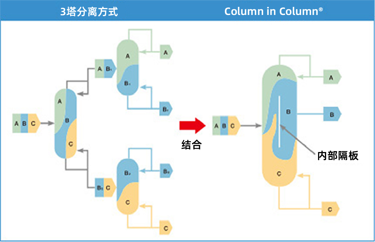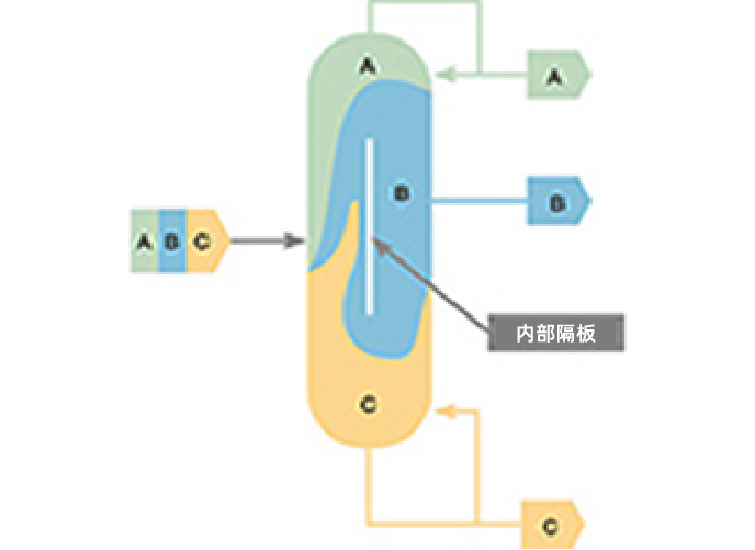 进行多成分蒸馏时,通常会串联多个蒸馏塔来进行分离和精炼,但是随着塔的数量每次增加,所需的公用工程也会随之增加,因此,在初始成本和运行成本两个方面,客户负担都会增加。住友的低耗能蒸馏技术Column in Column,通过在蒸馏塔内部设置隔板,能够在1个塔内分离3个成分。由此,与以往的多塔串联方式相比,能够减少设备数量并降低运行成本。