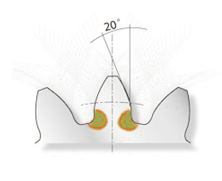 常规齿轮的压力角为20度,与此相对,PARAMAX的齿轮为25度。由此,确保齿根的厚度,提高强度。将负载容量较大、耐冲击载荷变速箱的设计变为可能。