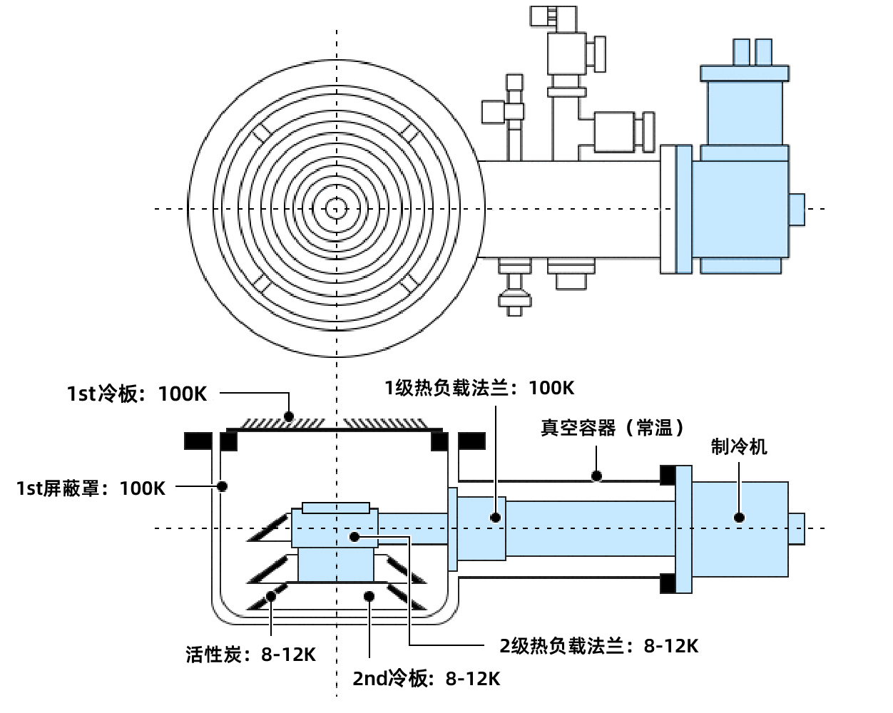 - Ar,N2在8-12K(2nd冷板)上凝结排气。