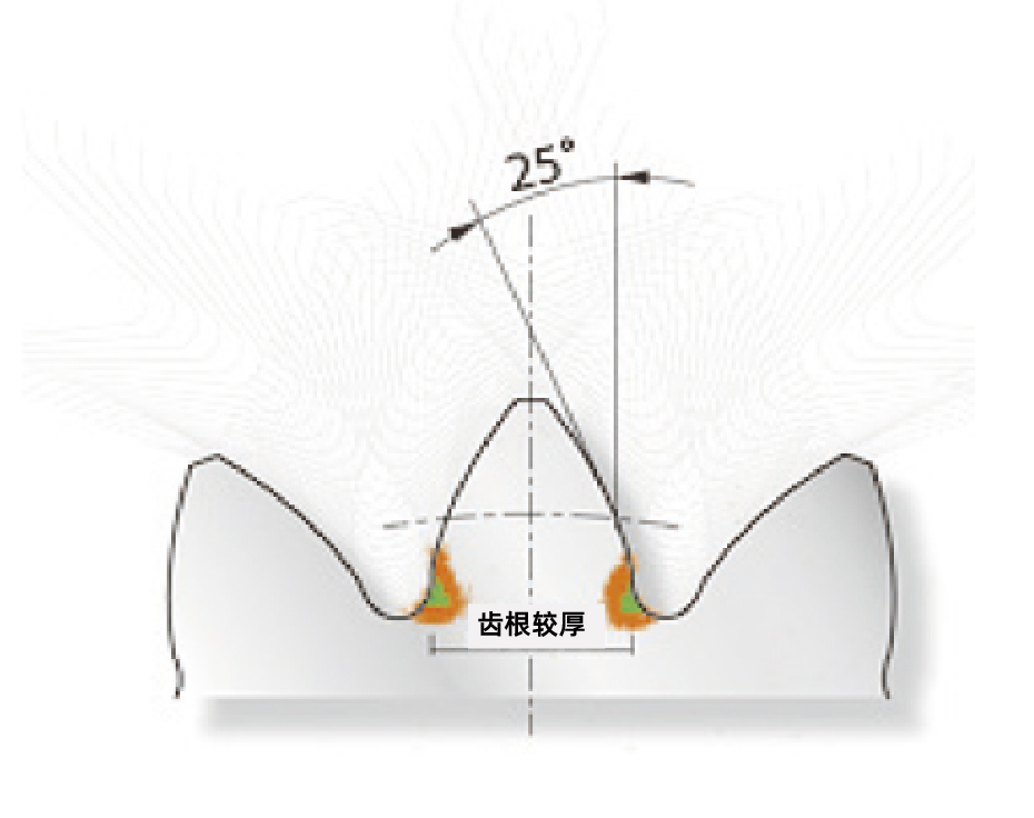 常规齿轮的压力角为20度,与此相对,PARAMAX的齿轮为25度。由此,确保齿根的厚度,提高强度。将负载容量较大、耐冲击载荷变速箱的设计变为可能。