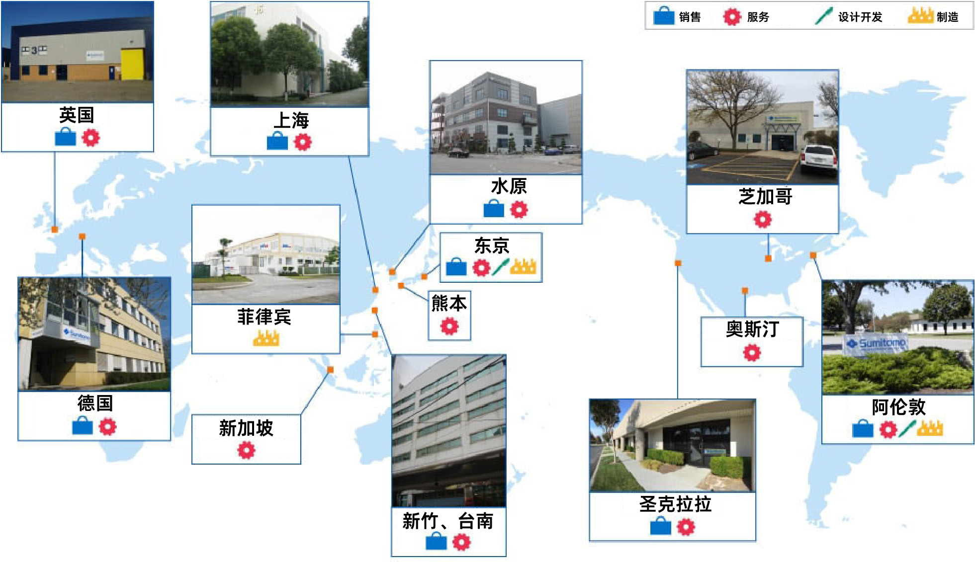 为了向全球客户提供支持,我们构建了销售、服务、制造的全球网络,努力提供同样的品质和性能。